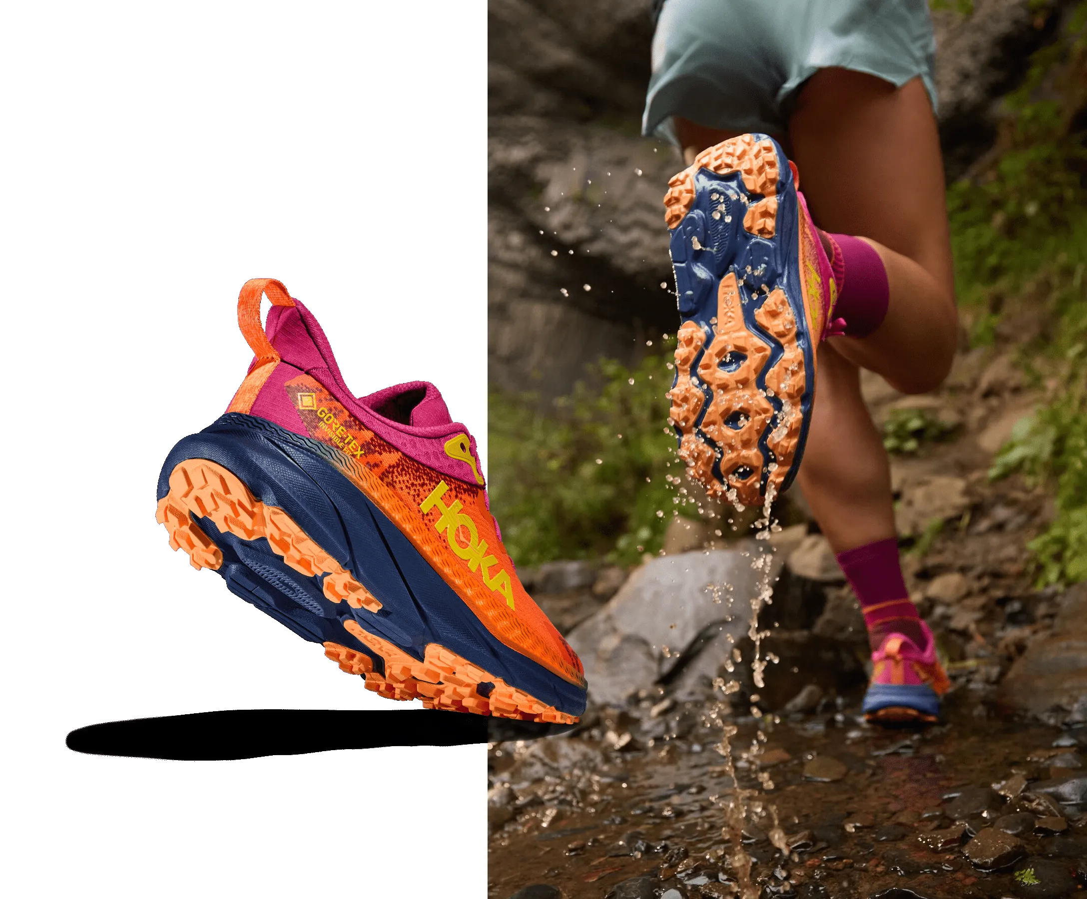 Built at the intersection of road and trail, the Challenger 7 GTX has been completely reimagined from the ground up. Combining a simplified mesh upper with a soft new foam, we’ve increased the stack height for a plusher feel and added GORE-TEX INVISIBLE FIT with recycled content product technology for enhanced protection in inclement weather. Inspired by gravel tires, we’ve cued up smaller, tightly spaced lugs in center and larger, more aggressive lugs at the perimeter designed for improved traction on uneven terrain.