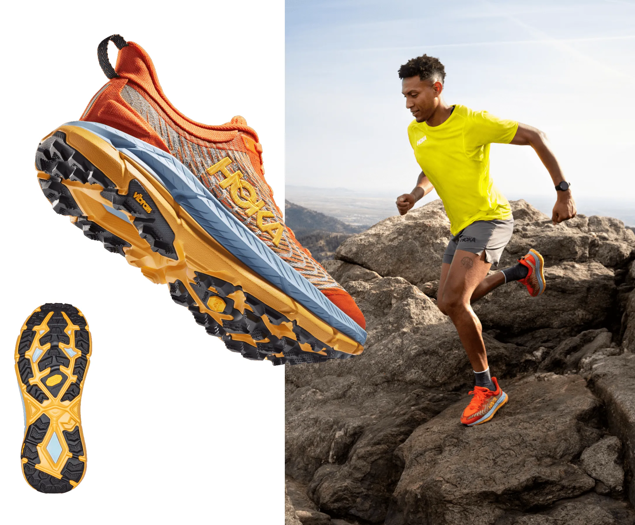 A pinnacle product for technical trail, the Mafate Speed 4 makes its debut, distilling what we’ve seen in the EVO Mafate and Mafate Speed. A familiar HOKA classic, just updated with new textiles and construction, including a breathable, single layer jacquard mesh and two-part PROFLY midsole with our lightest, most responsive HOKA foam just underfoot.